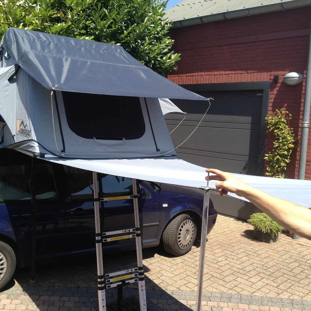 Nood aan extra beschutting onder de oversteek van uw daktent? Deze universele zijwand (te gebruiken op de meeste daktenten) zorgt voor beschutting tegen zon, regen en wind! Met de bijgeleverde stokken is hij zo omgevormd tot luifel om extra zit ruimte te creëren.