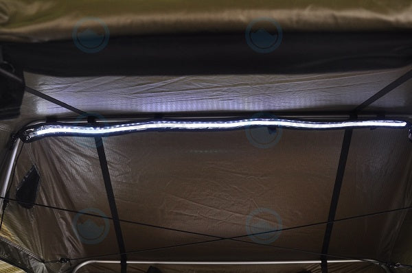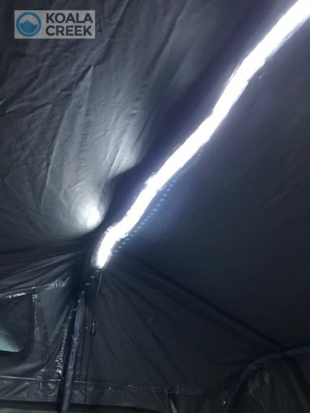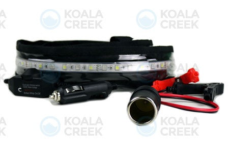 Erg handige 12 Volt LED verlichting, ca. 120 cm lang met 5 meter snoer, gemakkelijk op te hangen in daktent-tent-luifel. Met 12v stekker (sigarettenaansteker plug). Traploos dimbaar.