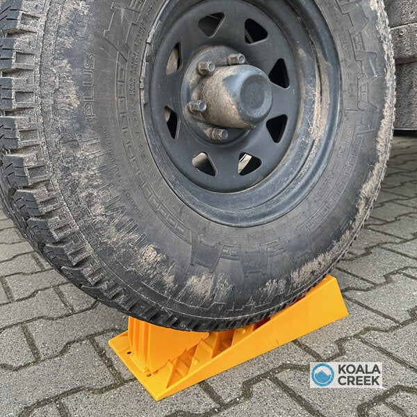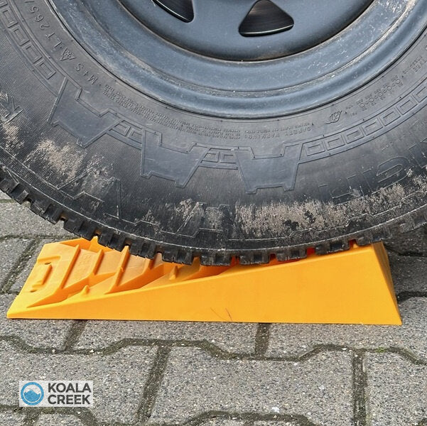 Zet je slaapplek op zijn plaats (daktent - caravan - camper - aanhangwagen). Rij hem daarna 30 cm. naar voor, leg de Koala Creek® levell-IT achter het wiel. Laat iemand kijken naar de gemonteerde waterpas. Verplaats je slaapplek en rij op de level-IT totdat je slaapplek in 2 richtingen waterpas staat. Leg de wielkeg op de level-IT of voor een andere band.