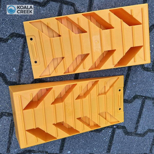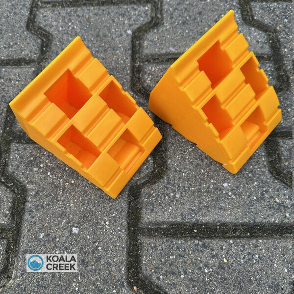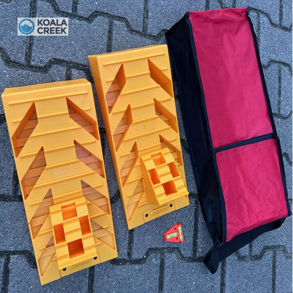 In één keer alles bij de hand om je auto, 4x4, caravan, vouwwagen, bus of camper waterpas te zetten.