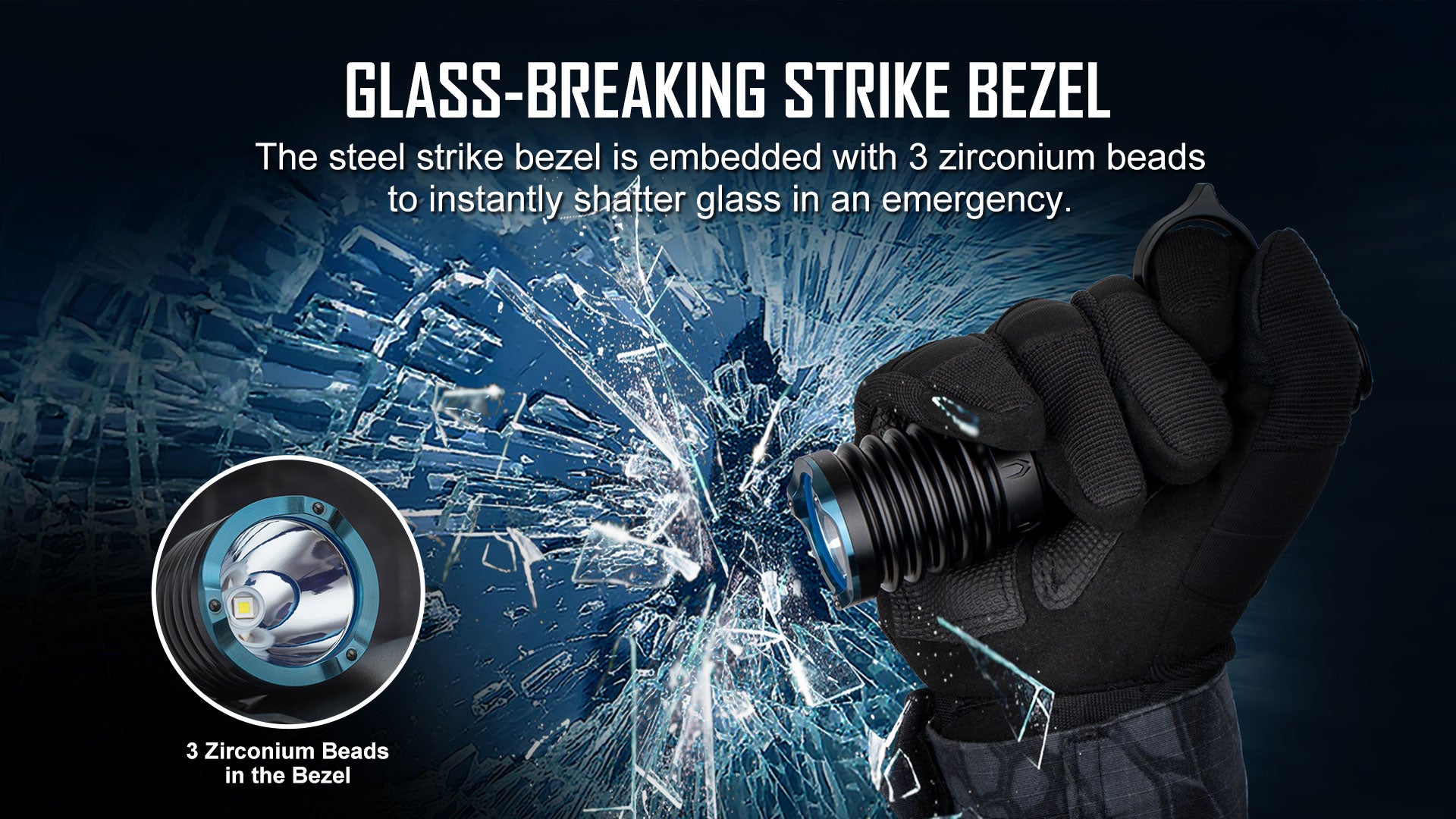 Geleverd met twee verwisselbare grip ringen en getextureerde behuizing zorgen voor extra grip in alle omstandigheden. Achteraan is de schakelaar om de 2 standen te selecteren, afhankelijk van hoever je deze schakelaar indrukt wordt één van de standen gekozen. Deze schakelaar is ook een magnetisch ophang- en oplaadpunt voor de bijgeleverde oplaadkabel (MCC3). Wanneer de batterij bijna leeg is geeft de lamp een trilsignaal, 20% batt elke 5 minuten, 10% 1x per minuut. De trilling is geluidloos en enkel actief wanneer de lamp is ingeschakeld. De ring vooraan op de lamp is uitgerust met zirkonium glasbrekers, hierdoor kan je in een noodsituatie de lampt gebruiken om een ruit in the slaan.